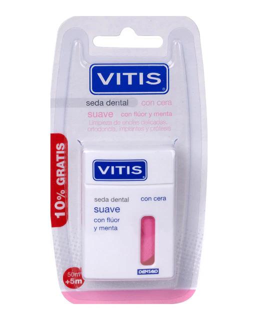 La seda dental suave Vitis reduce eficazmente la placa bacteriana del espacio interproximal y bajo la línea de las encías, previniendo la aparición de caries, gingivitis y enfermedad periodontal. Alcanza las zonas difíciles de acceder con el cepillo. Fácil penetración en los espacios interproximales: las microceras que contiene la seda facilitan su deslizamiento por los espacios más estrechos, previniendo dañar los tejidos blandos. Seda texturizada: seda formada por 12 fibras texturizadas que permanecen agrupadas al introducir la seda entre los dientes. Máxima suavidad: sus fibras, en contacto con la saliva, se hinchan y adquieren una textura algodonosa, facilitando una suave e indolora limpieza de los espacios interproximales y el margen subgingival. Con flúor: refuerza el esmalte en los lugares de más difícil acceso. Ideal para encías delicadas, portadores de ortodoncia e implantes.
