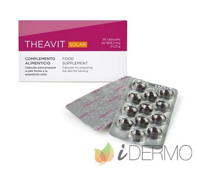 Theavit Solar 36 cápsulas es un complemento alimenticio indicado para mantener la piel protegida de los efectos nocivos del sol. La radiación solar es perjudicial para la piel, provocando daños a largo plazo que son irreversibles. El fotoenvejecimiento prematuro de la piel es un problema común asociado con la exposición al sol. Para evitar estos daños, es esencial utilizar un protector solar adecuado, así como complementos alimenticios que ayuden a mantener la piel a salvo. Theavit Solar es ideal para ello. Elaborado a base de antioxidantes, aminoácidos y ácidos grasos omega 3, consigue fortalecer las defensas de la piel frente a los radicales libres que la dañan y causan envejecimiento prematuro. Cuida y protege tu piel con este complemento alimenticio Theavit Solar 36 cápsulas.